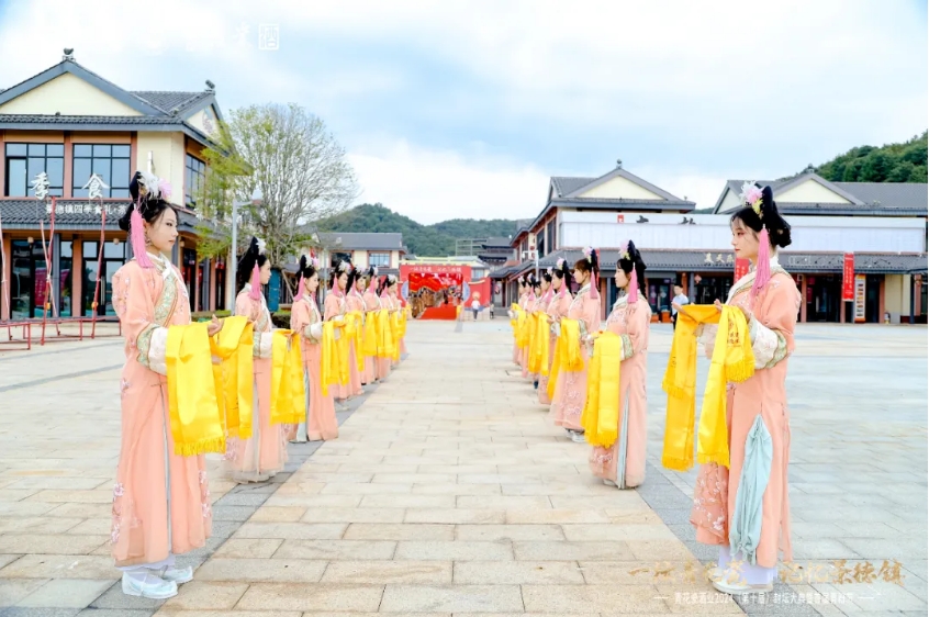 在古樸典雅的氛圍中,伴隨著氣勢磅礴的迎賓群鼓,身著一襲華服的禮儀仕女,為遠道而來的賓客禮呈綬帶,將這份富貴吉祥、幸福安康、福澤綿長的美好祝愿送上。
