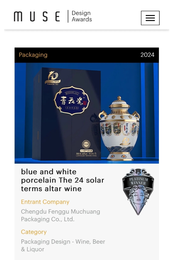 近日,美國(guó)繆斯設(shè)計(jì)獎(jiǎng)公布了2024年度評(píng)選結(jié)果,青花瓷酒業(yè)二十四節(jié)氣封壇酒憑借卓越的設(shè)計(jì)和創(chuàng)新理念,從全球眾多參賽作品中脫穎而出,一舉奪得繆斯設(shè)計(jì)獎(jiǎng)的最高榮譽(yù)——“鉑金獎(jiǎng)”。