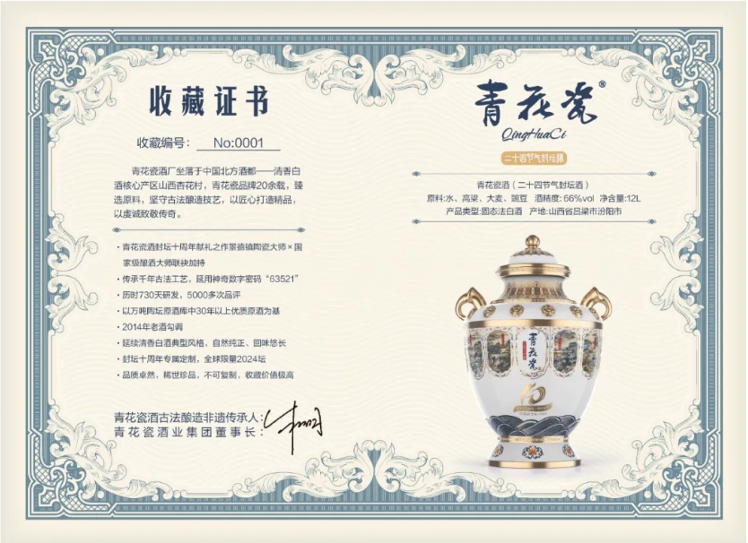 二十四節(jié)氣封壇酒酒壇由“成都風(fēng)古創(chuàng)意”與青花瓷酒業(yè)董事長(zhǎng)朱明共同創(chuàng)意,采用傳統(tǒng)陶瓷工藝中最復(fù)雜的釉下彩工藝,歷經(jīng)數(shù)十道工藝燒制而成。壇身繪制了古代宮廷十二個(gè)月份不同的景色,再現(xiàn)季節(jié)更替、物候變化,聚集中國(guó)傳統(tǒng)文化元素,是東方美學(xué)的強(qiáng)勢(shì)表達(dá)。二十四節(jié)氣封壇酒是青花瓷酒業(yè)封壇十周年專屬定制酒,售價(jià)19999元,每壇獨(dú)立編碼,全球限量2024壇。