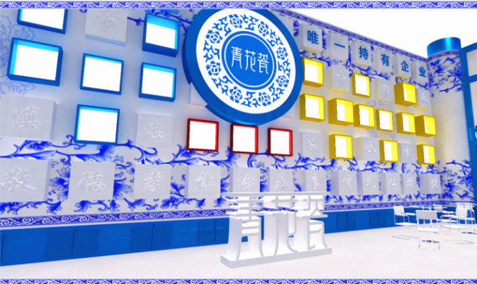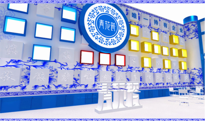 而本次展位設(shè)計(jì)中最為獨(dú)特的亮點(diǎn)則是面向展位正門(mén)的巨幅背景墻,整幅背景墻以青花瓷酒業(yè)LOGO為核心,整齊排列著數(shù)十個(gè)漢字方塊,遠(yuǎn)遠(yuǎn)望去仿佛古老神秘活字印刷術(shù)中的反文字模,錯(cuò)落有致中透露出濃濃的文化氣息。細(xì)觀這些漢字模塊,“仁、義、禮、智、信、溫、良、恭、儉、讓……”一個(gè)個(gè)鮮活的中國(guó)漢字躍然其上,靜靜地透露出一縷芬芳儒雅的人文氣息。