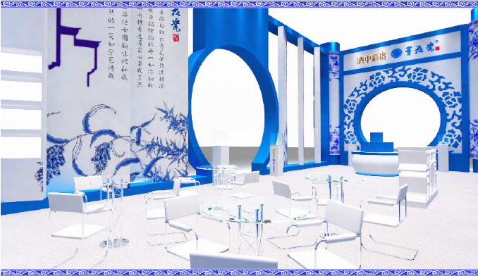 細(xì)品青花瓷酒展位效果圖,四個(gè)巨形青花畫(huà)軸將展位分割成一個(gè)三面通透的方形園林式建筑,三面通透的墻面猶如三幅蔓延舒展開(kāi)的青花畫(huà)卷,映襯其中的滿月形拱門(mén)讓人不禁聯(lián)想到曲苑亭深的蘇州園林,雖無(wú)小橋流水,卻也蘊(yùn)含著些許清幽飄渺的意境。
