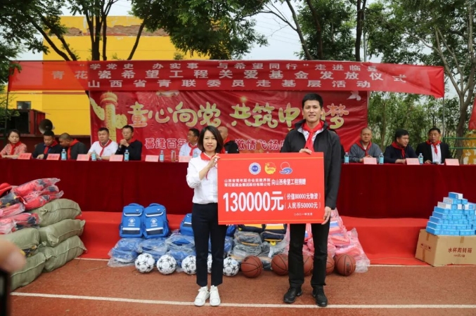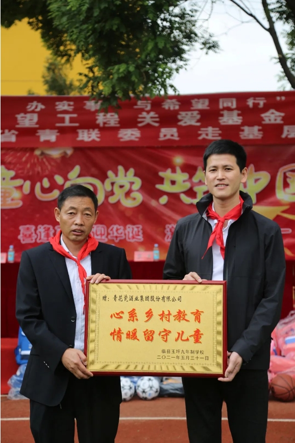 在助學(xué)活動(dòng)中,青花瓷酒業(yè)集團(tuán)股份有限公司向山西希望工程捐贈(zèng)物資及現(xiàn)金共計(jì)130000元。為全校學(xué)生發(fā)放書包、水杯、體育用品、學(xué)習(xí)用品等助學(xué)物資,同時(shí)還為該校30余名“建檔立卡”的貧困家庭學(xué)生每人發(fā)放了1000元助學(xué)基金。隨后,臨縣玉坪鄉(xiāng)小學(xué)校長向朱明董事長贈(zèng)送“心系鄉(xiāng)村教育,情暖留守兒童”感謝牌。