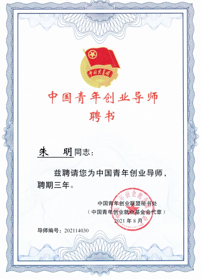 喜報(bào)丨朱明董事長(zhǎng)被聘為中國(guó)青年創(chuàng)業(yè)導(dǎo)師