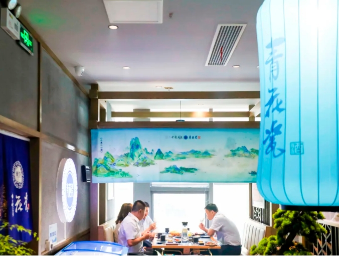 品鑒館坐落于日照核心商業(yè)區(qū),以“烤肉食堂”為主要載體,集清香產(chǎn)品展、品質(zhì)餐食、商務(wù)洽談、聊天聚會(huì)等多功能于一體,實(shí)現(xiàn)品牌與餐飲的深度融合,創(chuàng)新融合方式,有效鏈接不同年齡消費(fèi)群體,擴(kuò)大品牌受眾,打造沉浸式品鑒場(chǎng)所。店內(nèi)形象設(shè)計(jì)上充分運(yùn)用青花瓷主題元素,通過(guò)色彩和山水畫的搭配,構(gòu)建宴飲雅集概念,打造喧囂中的「世外桃源」,營(yíng)造出濃厚的文化氛圍,增強(qiáng)了文化品鑒的體驗(yàn)感。